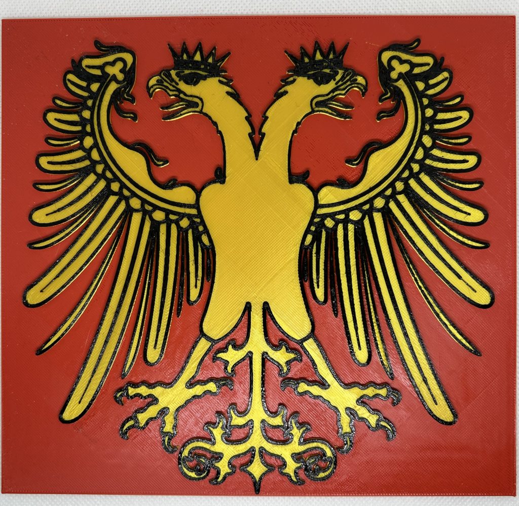 Na slici je prikazana zastava Skenderbega, slavnog srpskog vladara. Zastava je rađena radi oživljavanja dela srpske istorije na jedan drugačiji način. Litografijom je zastava izvedena u 3D model, i tako štampana u više slojeva, iako postoji mogućnost štampanja u jednom sloju.