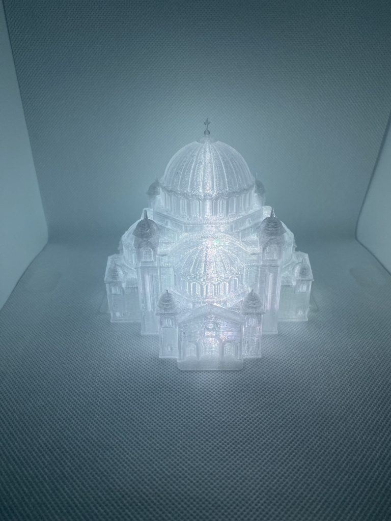 Ova precizno izrađena 3D maketa Hrama Svetog Save prikazuje bogatstvo detalja i impozantnost arhitekture u smanjenom formatu. Štampana transparentnim filamentom sa led sijalicom, savršeno ilustruje mogućnosti 3D štampe za izradu maketa, suvenira i dekorativnih elemenata inspirisanih kulturnim nasleđem. Moguće je prilagođavanje u vidu veličine, boje, kao i dodavanje željenog natpisa. Moguća je prodaja sa i bez led sijalice.