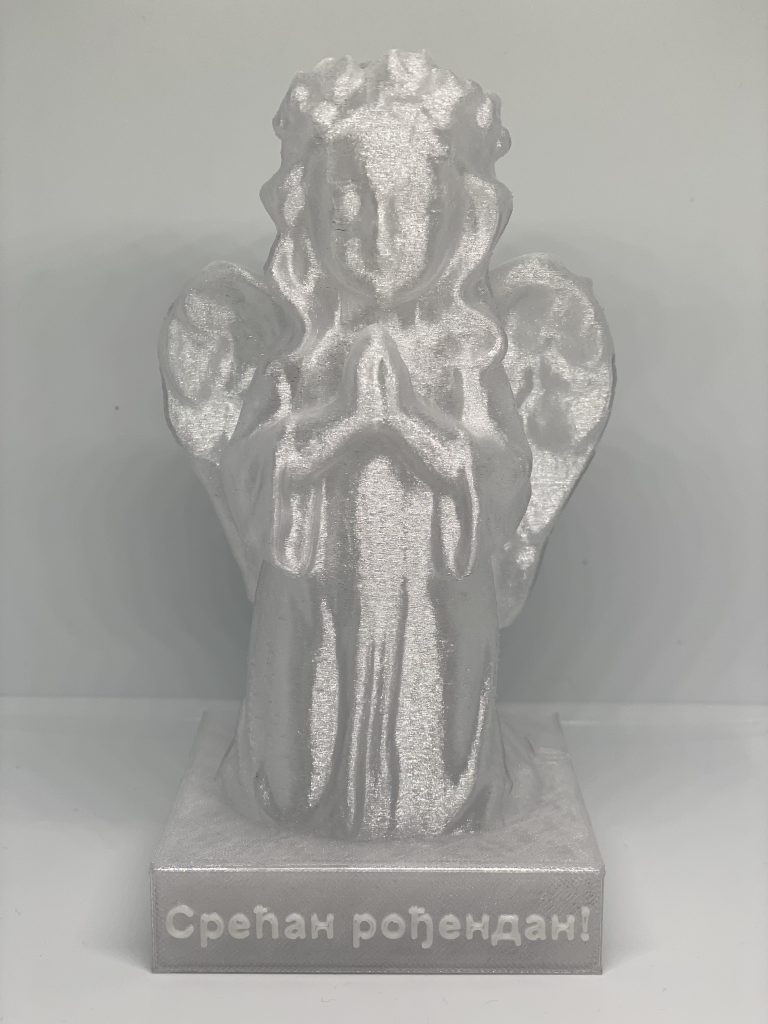 Na slici je prikazan elegantno izrađen anđeo sa natpisom, štampan u bisernom filamentu uz precizne crne detalje. Ova unikatna dekoracija savršeno pokazuje mogućnosti personalizacije u 3D štampi – idealna za poklone koji se pamte zauvek. Moguće je prilagođavanje u vidu veličine, boje kao i natpisa na slici. Idealno za poklon za različite prilike!
